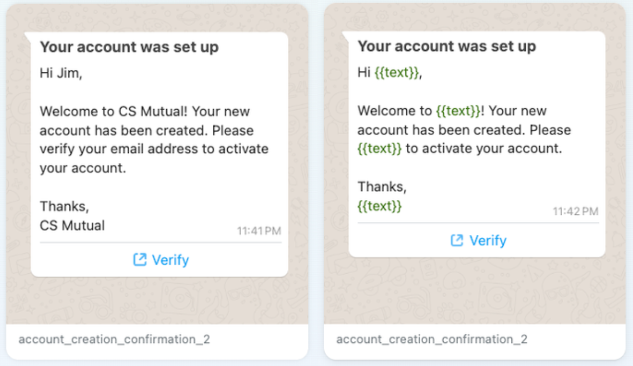 These pre-written templates have already been categorized and priced as utility or authentication. These templates contain fixed content that cannot be edited and parameters you can adapt for business or user-specific information.
