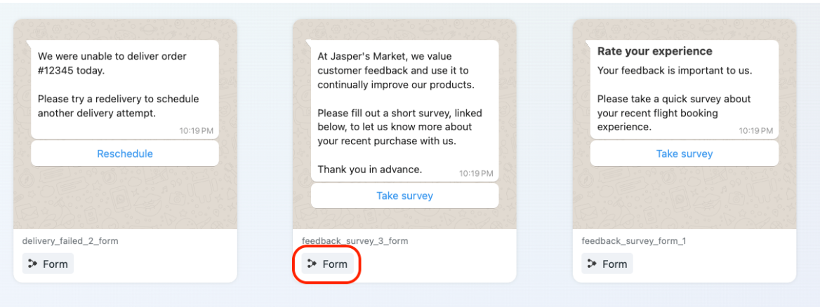 In WhatsApp Manager, you can identify these specific templates by the "Form" label they contain. The current supported use cases are *Customer Feedback* and *Delivery Failure*.